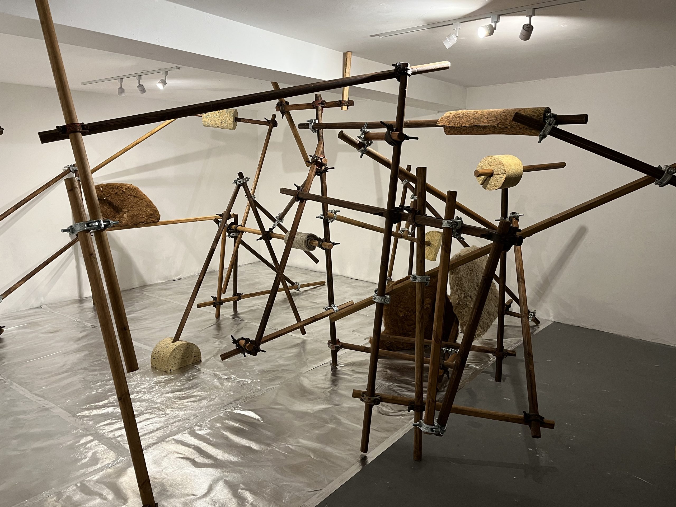 I’m using this residency to focus upon testing and translating these sculptures that have emerged from site-specific work for a gallery context. I’ll be bringing expansive works created over the last few years alongside and into conversation with each other. In the initial few weeks, the wool and forms from Flockstones (shown in Exeter Contemporary Open) and Deadstock (Studio Paradiso & Plymouth Art Weekender) have been utilised and experimented with in BLW. Over the coming weeks of the residency these will be followed by the wooden scaffolding and clamps from the recent Remember Nature commission by the Gustave Metzger Foundation Functional Disobedience and the bracken and willow Cuckoo hide, recently resurrected at RAMM.