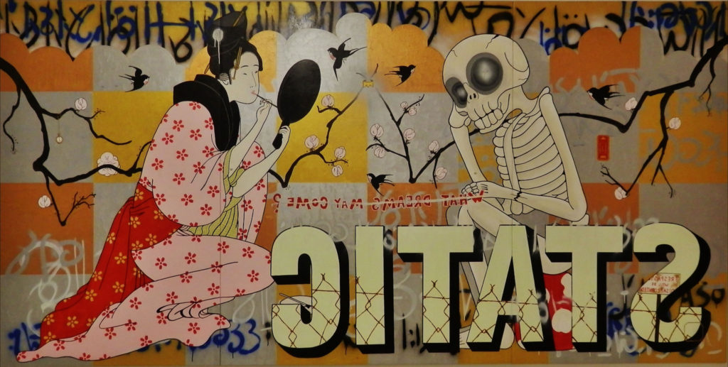 Dan’s recent series of paintings express themselves in the richly decorative, utopian beauty, and conflict narrative aesthetic of a classic Japanese culture. This aesthetic provides the rich ground – with its glimpses of ‘the destination of promise’ (as above) – within which Richardson creates a narrative journey of an internal power struggle between disputed positions of subjectivity induced by our own conflicted contemporary culture, which plays itself out across and between the paintings.