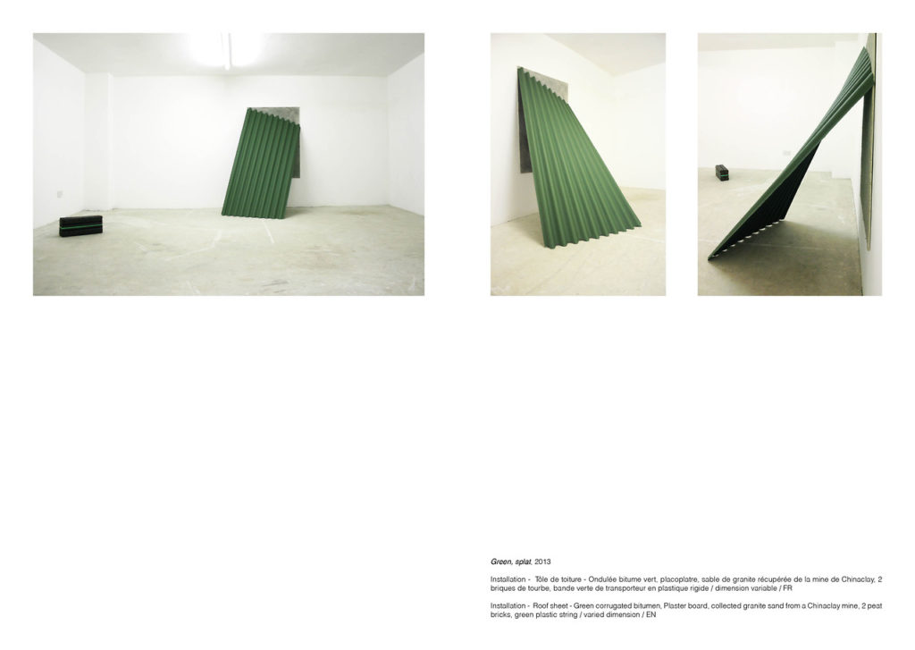 The gaze and reinterpretation are two elements that extend across my research. My work starts from observations of the landscape. The reality of the landscape exists there for me in various forms. As a green field painted green, the painted surface plays a decisive role in the appearance and expressiveness of the Korean landscape. In the same manner, France exports the idealized beauty of its landscapes and its buildings through images, attracting tourists. Also, the sublime, picturesque landscape persists in my head. What do these pictorial landscapes mean and where do they take me to? In situating myself between what incites us to see and what remains hidden behind the smooth surface of images or realities around us, I develop a questioning of the perception of the landscape. It is the passage from pictorial things to real things that I freeze in deliberate space and time. What is interesting in my opinion, is to reveal the characteristic of those scenic phenomena, and then divert them or recombine them to find a new facet of the urban landscape. While the landscape of the past in paint becomes the sublime, what brings us closer to the urban landscape? Putting physically my gaze on the landscape, I recompose the landscape with mundane images or trivial materials. From a simple layout of elements and an enhancement of materials, my installations are the result of a process aiming at a break. Assuming the reality of the urban landscape, I allow myself to extract an aesthetic possibility from the elements.
