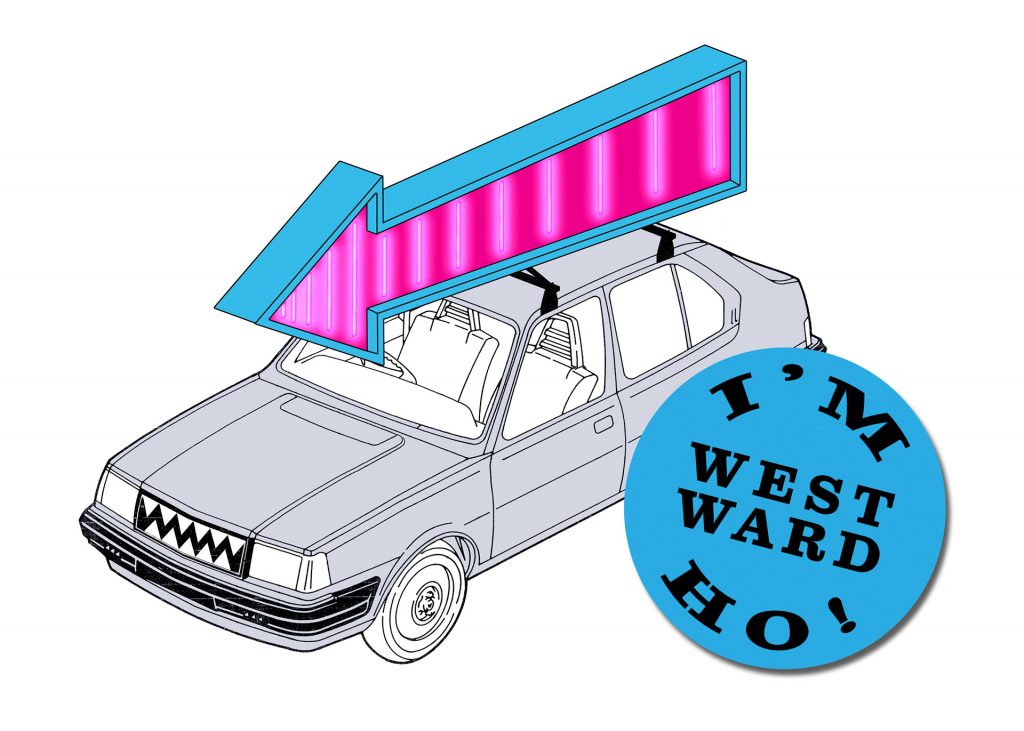 Stuart Robinson has created a mobile, moving artwork exploring his childhood journeys from the Midlands to coastal holidays in the South West. It features a 1980s Volvo 340 and a large Neon style arrow.
